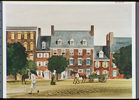 Colonial street scene in Philadelphia. Shown are a man on horseback and others on foot with a horse-drawn wagon.