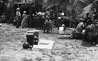 A black and white wide image of an event. In the center of the image there are three drums and three gourds lined up on a woven mat. Behind the instruments there is a cushion on the woven mat as well. On the right side of the image there is a group of people sitting in chairs. They are looking away from the camera towards a band located in the upper center of the image. All six members of the band are playing instruments. One man standing towards the seated audience is playing a bass while the others are playing guitars. On the left side of the band there is an older man and woman watching the band. The woman is wearing a dress with a floral design and a lei. She is holding onto a palm tree with her left hand. To the right of her is a man. He is wearing a short sleeve collared shirt and pants. In the background there is dense vegetation.