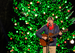 A man performs with a large Christmas Tree behind him