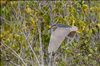The black-crowned night heron, also called auku'u in Hawaiian, isn't a typical heron in appearance. It has a relatively stocky body with a shorter bill, legs and neck compared to other herons. Its resting posture is normally somewhat hunched but when hunting an auku'u will extend its neck and look more similar to other wading birds. Adults are light-gray with a neat black back and black crown (as in the photo). Immatures are brown with large white spots on the wings and blurry streaks on the underparts. The bill also changes color from yellow and black in youth to a solid black in adulthood.
