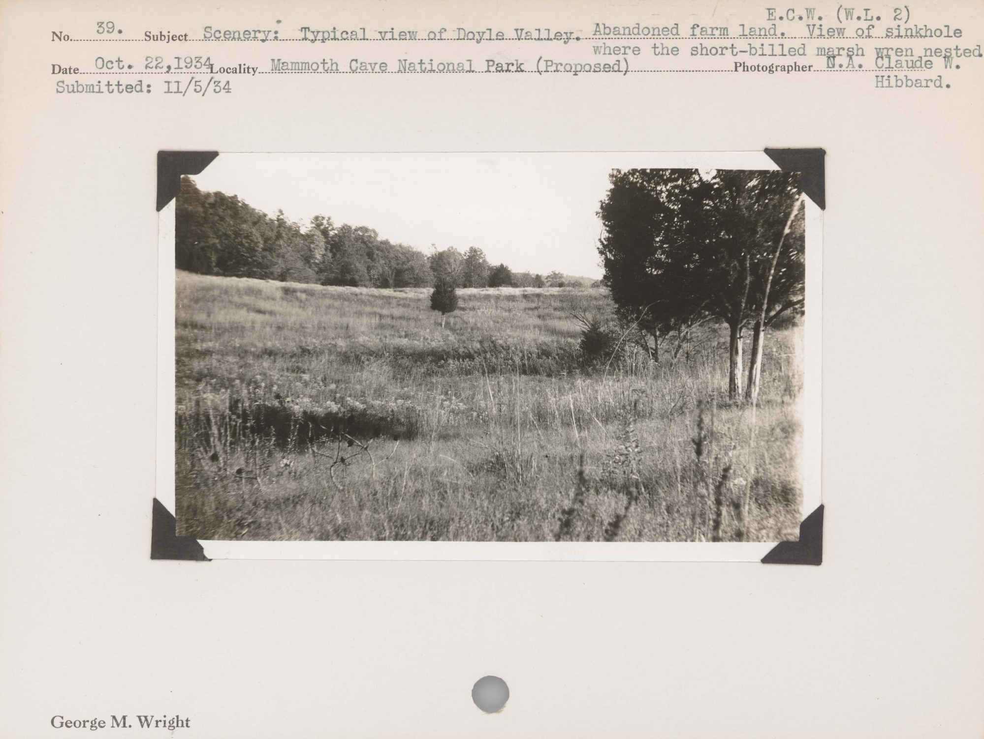 Scenery: Typical view of Doyle Valley. Abandoned farm land. View of sinkhole where the short-billed marsh wren nested. Negative #: E.C.W. [Emergency Conservation Work] W.L. 2. Locality: Mammoth Cave National Park (Proposed).