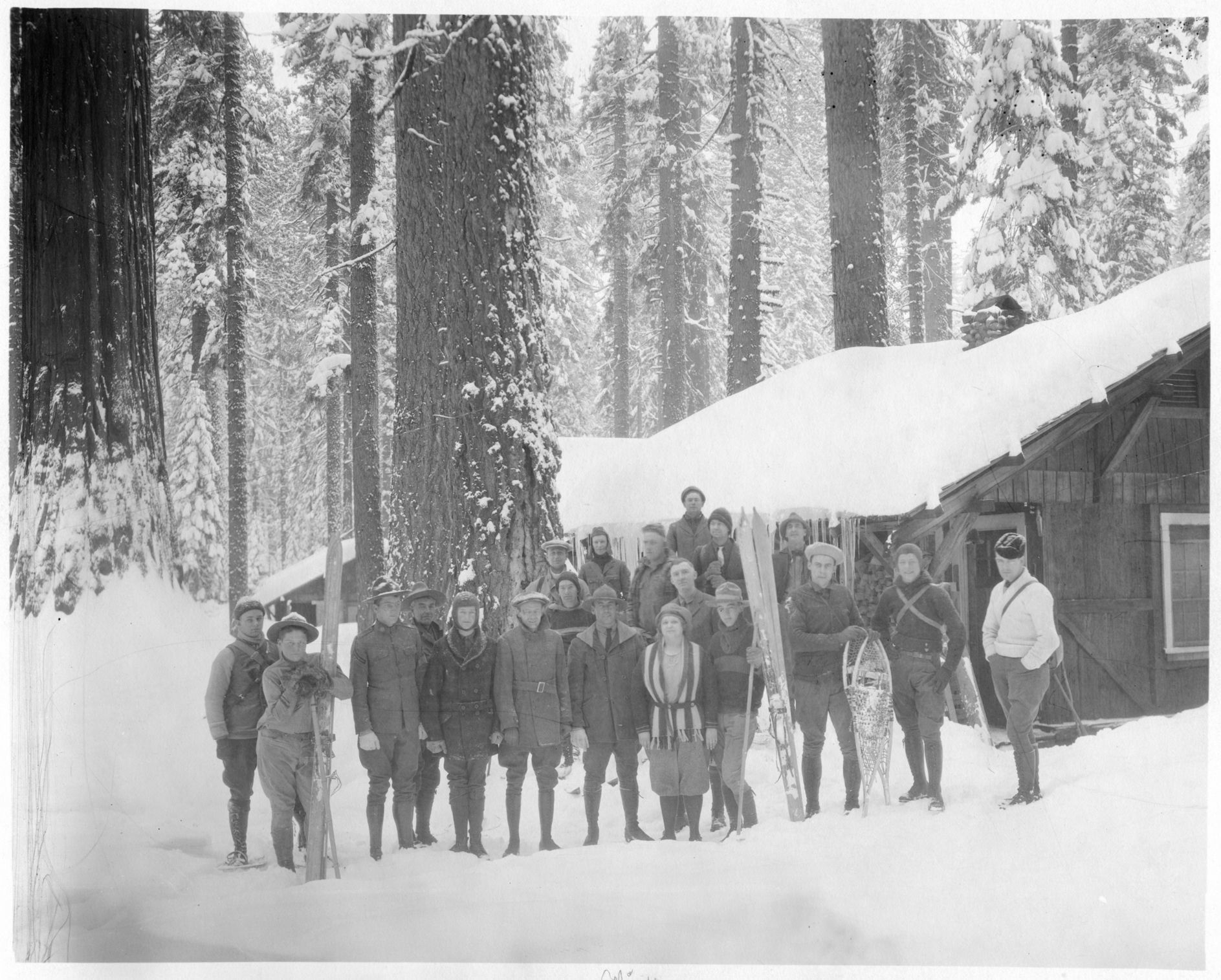 Skiing early skiers in Giant Forest. George Magley and wife in center. NPS Individuals. [8x10 print]
