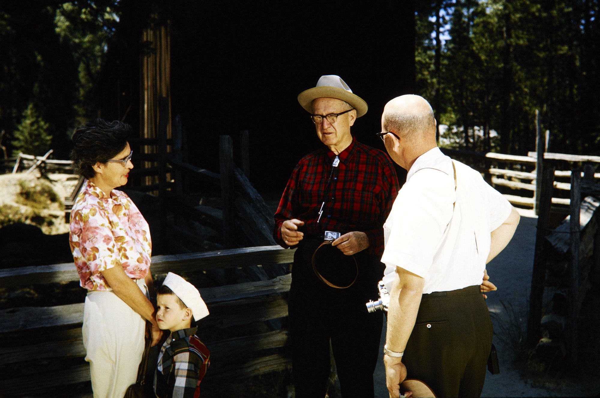 NPS director Horace Albright speaking with an elderly woman, a small boy, and a man with a camera around his neck.
