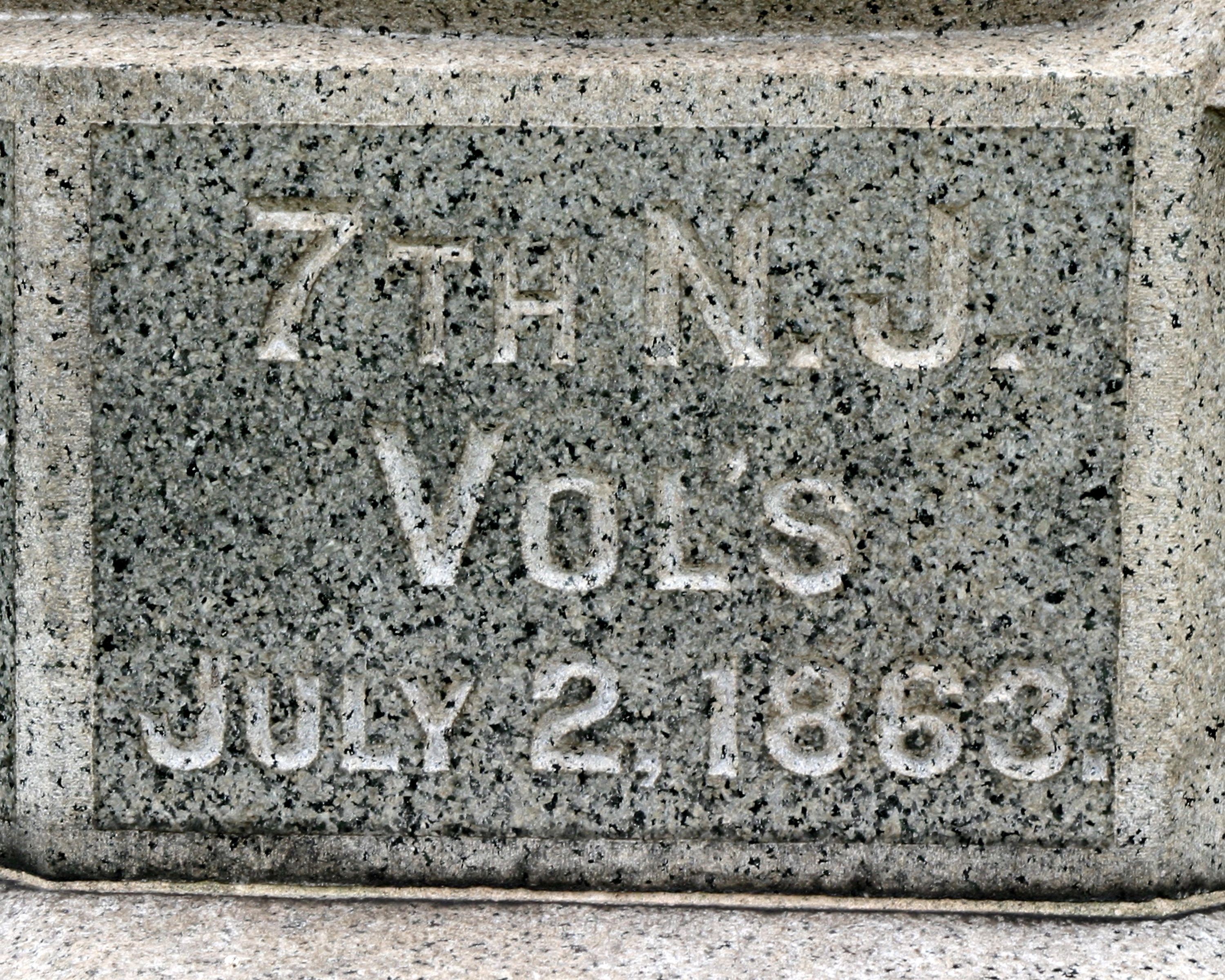 1 of 12 mns in Park to NJ troops in Gettysburg Campaign. Marks site where Col Francine was wounded on July 2, 1863 when 7 NJ was here supporting Clark's NJ Battery. Located E of Sickles Ave between Wheatfield Rd & United States Ave in Excelsior Field || Rough hewn base w/ smooth & polished shaft in form of minie ball. Base 6' square, shaft 9'11" in circumference, 8'5" high. Incised inscriptions. 1 laurel leaf is chipped.