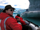 Photo by Jim Pfeiffenberger. Repeat glacier photography research project in KEFJ, August 2005. NPS Ranger Doug Capra and USGS researcher Bruce Molnia (with head facing away) near Bear Glacier with icebergs.