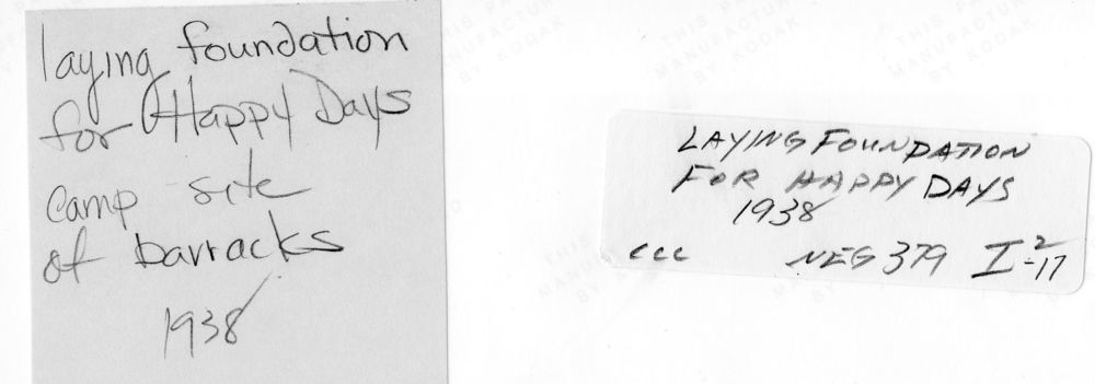 Construction of Happy Days Camp (now Happy Days Lodge), Civilian Conservation Corps ca. 1938. See scan of writing on the back of each image for additional details. || Many of the historic structures in the Virginia Kendall unit of Cuyahoga Valley National Park were built by Civilian Conservation Corps workers during the 1930s.