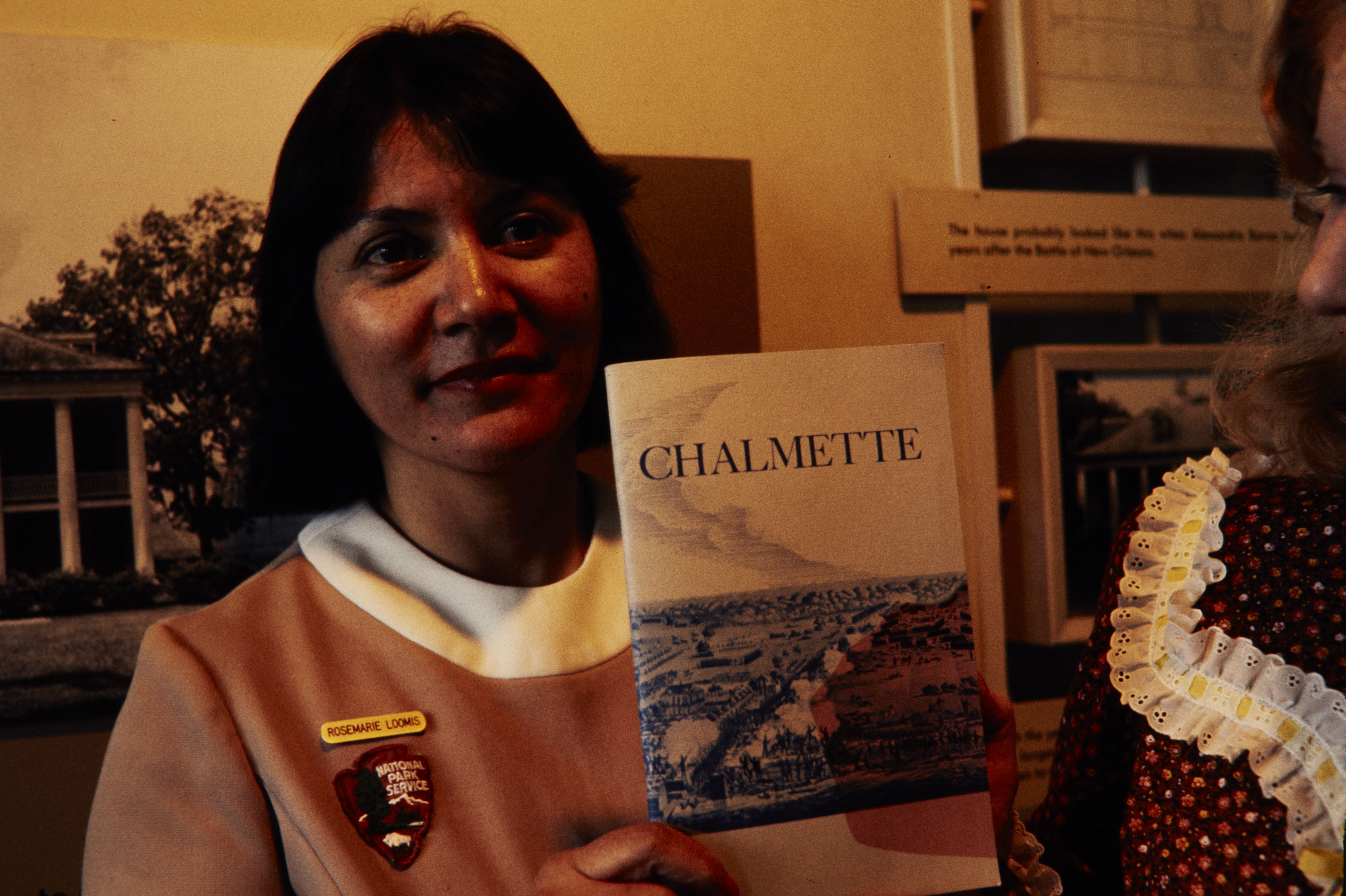 NPS employee, Rosemarie Loomis holding up a pamphlet for Chalmette in Jean Lafitte National Historical Park and Preserve.