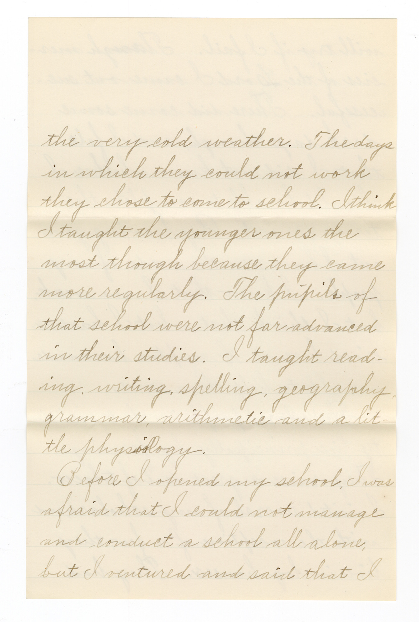 [p. 2] I told you about my school in my other letter, all that was of any importance. I completed a term of five months. The patrons seemed to be very well pleased, and some said that they would like to have me back again. I had a very full school the whole term. During the term, I had about sixty-five or more enrolled, but I never had more than thirty-five in school at once. The school-house was a very neat little frame building. It had been built about three years I think. I had a great many large girls and boys during [p. 3] the very cold weather. The days in which they could not work they chose to come to school. I think I taught the younger ones the most though because they came more regularly. The pupils of that school were not far advanced in their studies. I taught reading, writing, spelling, geography, grammar, arithmetic and a little physiology.