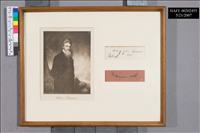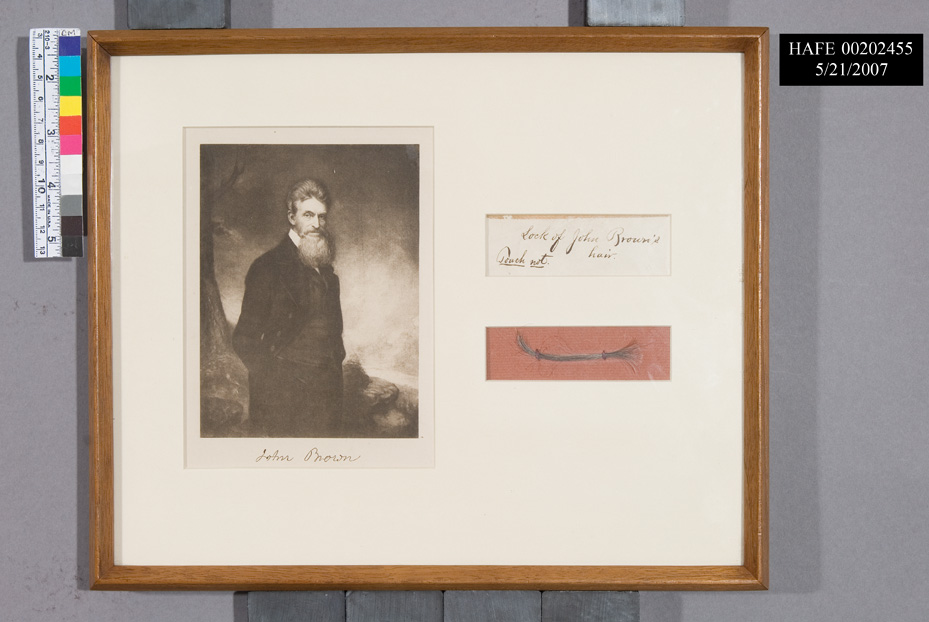 WOODEN FRAME AND PLEXIGLASS WITH CUTOUT MATTING WITH ENGRAVING OF JOHN BROWN (HANDS IN PANTS POCKETS, TREE, ROCKS, IN BACKGROUND). BROWN W/BEARD. <CRSECOND CUTOUT HAS NOTE WHICH READS: "LOCK OF JOHN BROWNS HAIR. TOUCH NOT."<CRTHIRD CUTOUT HAS LOCK OF HAIR (2-1/2"L) HELD IN PLACE WITH THREAD.<CRREVERSE HAS WIRE FOR HANGING AND 2 WIRE SCREWS. ALSO HAS THREE PIECES OF PAPER ENCOSED IN MYLAR AND TAPE WITH THE WRITING:<CR"LOCK OF JOHN BROWN'S HAIR,<CRFROM W. R. BENJAMIN, ESQUIRE."<CR"I BOUGHT THE BROWN'S HAIR FROM THE GRANDSON OF W.L. GARRISON WHO ME THE FAMILY PAPERS. YOU CAN RELY ON IT'S BEING AUTHENTIC."<CR"YOURS<CRW.R. BENJAMIN"'