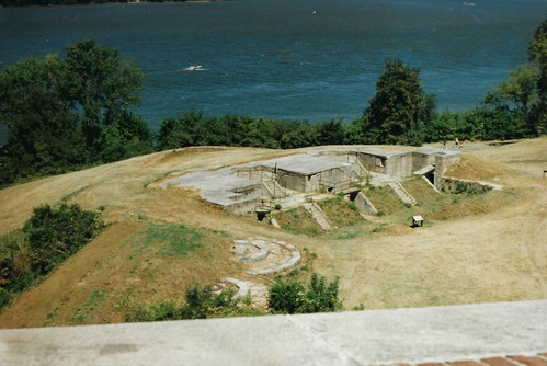 Photo of concrete gun battery, taken above in the fort. To the left of the photo are two large cannon stone cannon mounts for 15-inch Rodman Cannons.