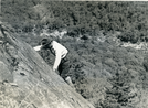 MAN CLIMBING UP A ROCK WITH A ROPE TIED AROUND HIS WAIST.