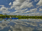 Kayaker in a wide waterway lined with trees with the clouds reflecting in the water