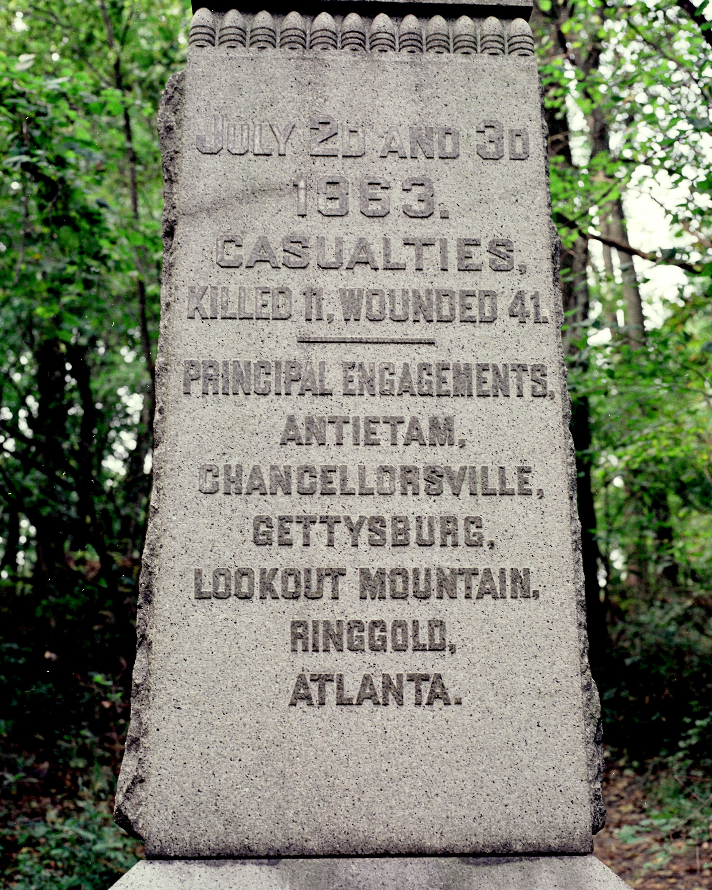 1 of 90 Monuments to New York. Indicates position held from 6:00 AM July 2, 1863 until 2:00 AM July 4, 1863. Position Marker locates area held by Co. I of regiment July 2 & 3, 1863. LF&RF markers 103' & 105' N-S of Mn. Mn located Culp's Hill summit. || Mn & 3 markers. Base 7'sq rough-cut, tooled edge. 2 part shaft, 1st: bronze state medallion, 2nd: smooth face front & rear w/polished excised inscriptions, rough-cut sides. Pryamid top w/excised star. All 12'4"H.