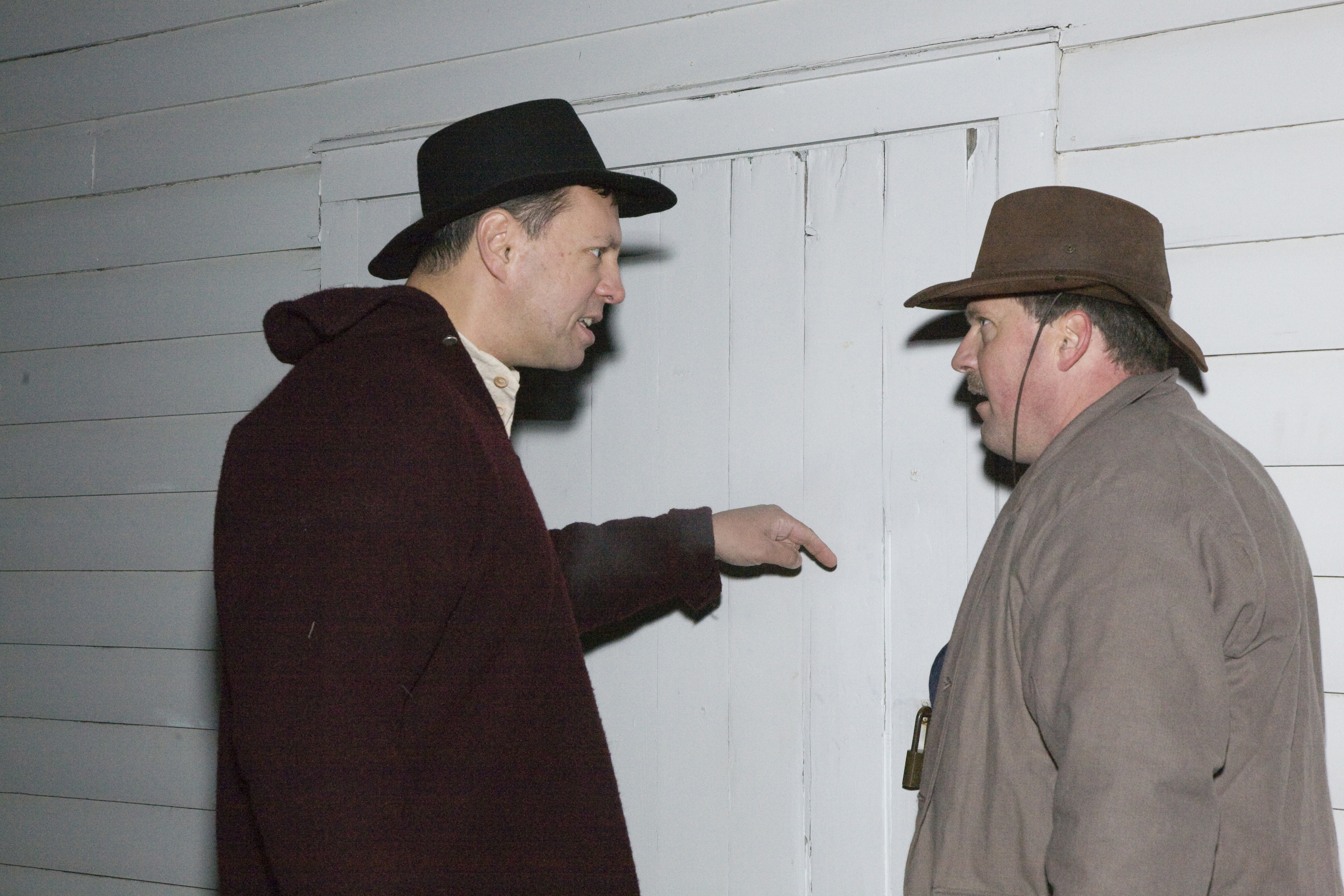 Volunteers practice their roles in a scene with slave catchers and free black women. || Cuyahoga Valley National Park interprets Ohio's Underground Railroad heritage because the centerpiece or our park, the Ohio & Erie Canal, was a likely route traveled by runaway slaves. Experience the Underground Railroad, offered each November, places visitors in the role of an escaping slave. The program is part of the National Underground Railway Network to Freedom which recongnizes historic sites, facilities, and programs that have a verifiable association to the Underground Railroad. The photos show volunteers at the dress rehearsal.