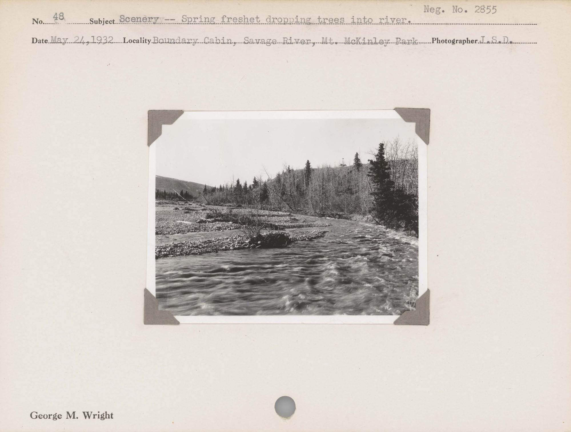 Scenery – Spring freshet dropping trees into river. Negative #: 2855. Locality: Boundary Cabin, Savage River, Mount McKinley National Park [Denali National Park].