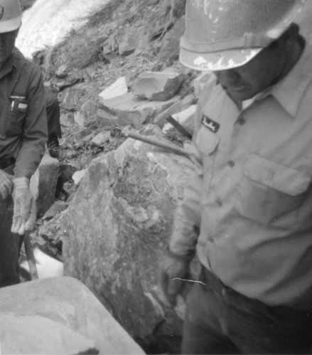 Workers repairing trail damage on the Hidden Canyon trail. ; ZION Museum and Archives Image 008.14.01-20of22 ; ZION 15933