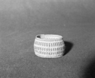 Private Collection. Object: Miwok basket. Dimensions: 7 1/4 x 2 1/2". Materials: Split shoots, bracken fern root. Technology: Interlocking stitch, three rods, fag ends trimmed on workface, moving ends trimmed on interior. Clockspring start filled by jammin