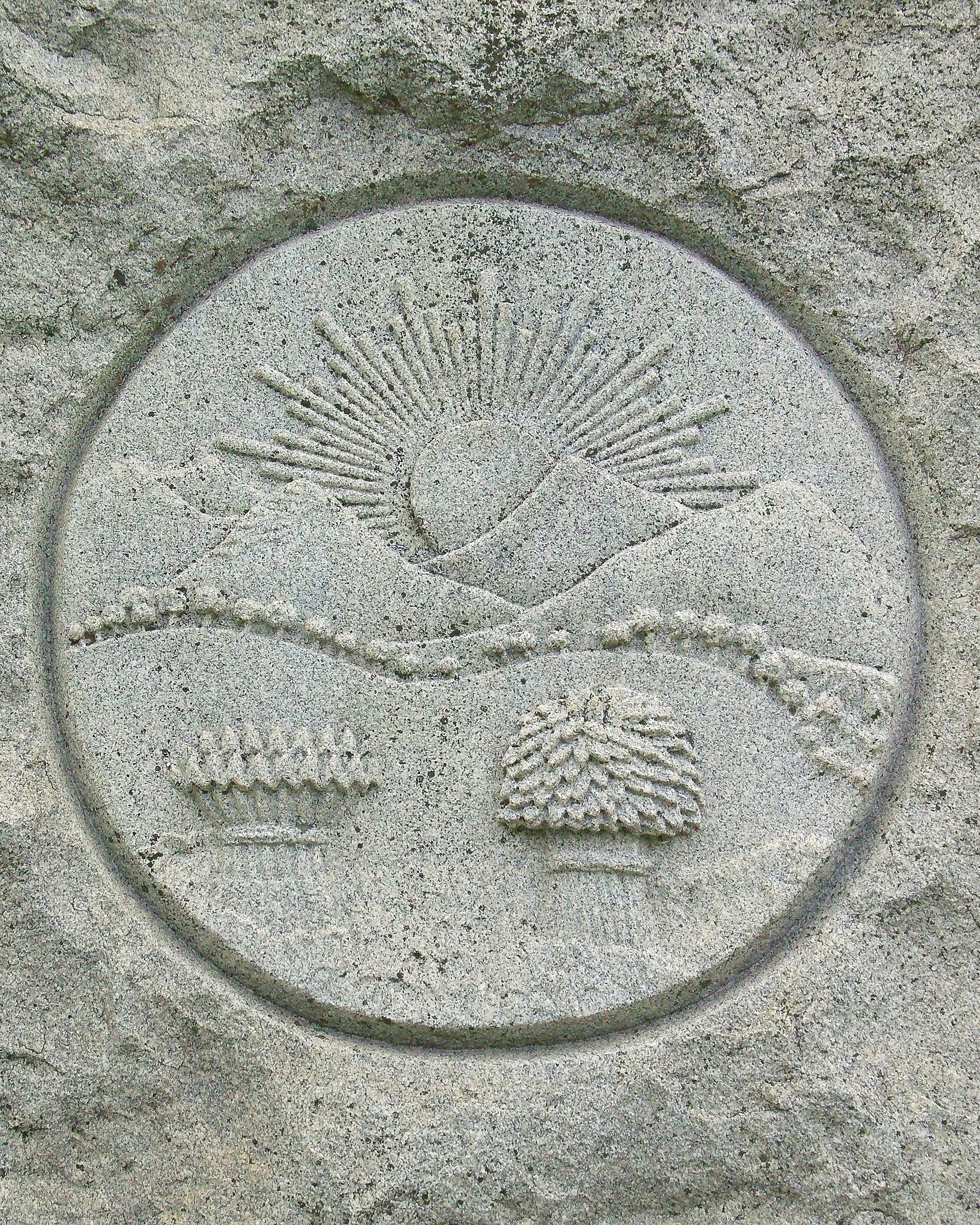 Of Barre granite, monument consists of a slender obelisk rising from a cubic pedestal supported by a three-step base. Pedestal is quarry-faced with inset smooth inscribed panel. Measuring 12' 4" square at the base, the monument's height is 48' 6".