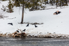 Ravens feed on different pulled apart parts of an elk carcass along the a river in snow.