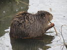 A beaver working hard to build a dam in the Pipestone Creek.