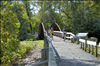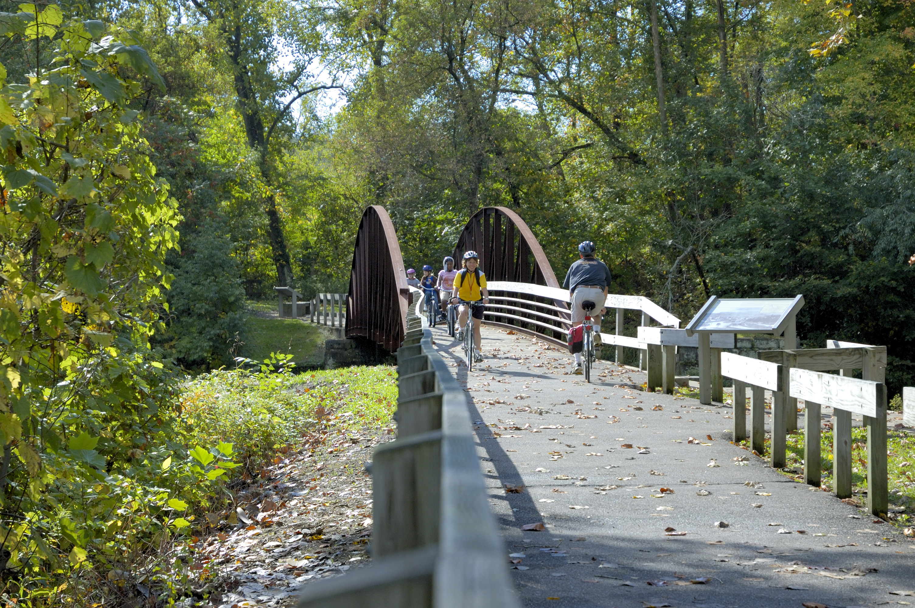 Volunteers lead small groups of students on a fall bike ride. One image is of students walking their bikes down the driveway of Stanford Hostel in Peninsula. The others are taken along the Towpath Trail at Boston Store Visitor Center (white building) and at Lock 29 (inside lock and on bridge) in Peninsula, OH. || Cycling Schools is a volunteer group of Cuyahoga Valley National Park. They lead free bicycling programs for Cleveland schools in spring and fall. The program begins at Stanford Hostel and features a ride along the Towpath Trail.