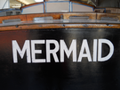 Stern of Kenichi Horie's boat, Mermaid (SAFR 8791), on exhibit on the Hyde Street Pier, August, 2012