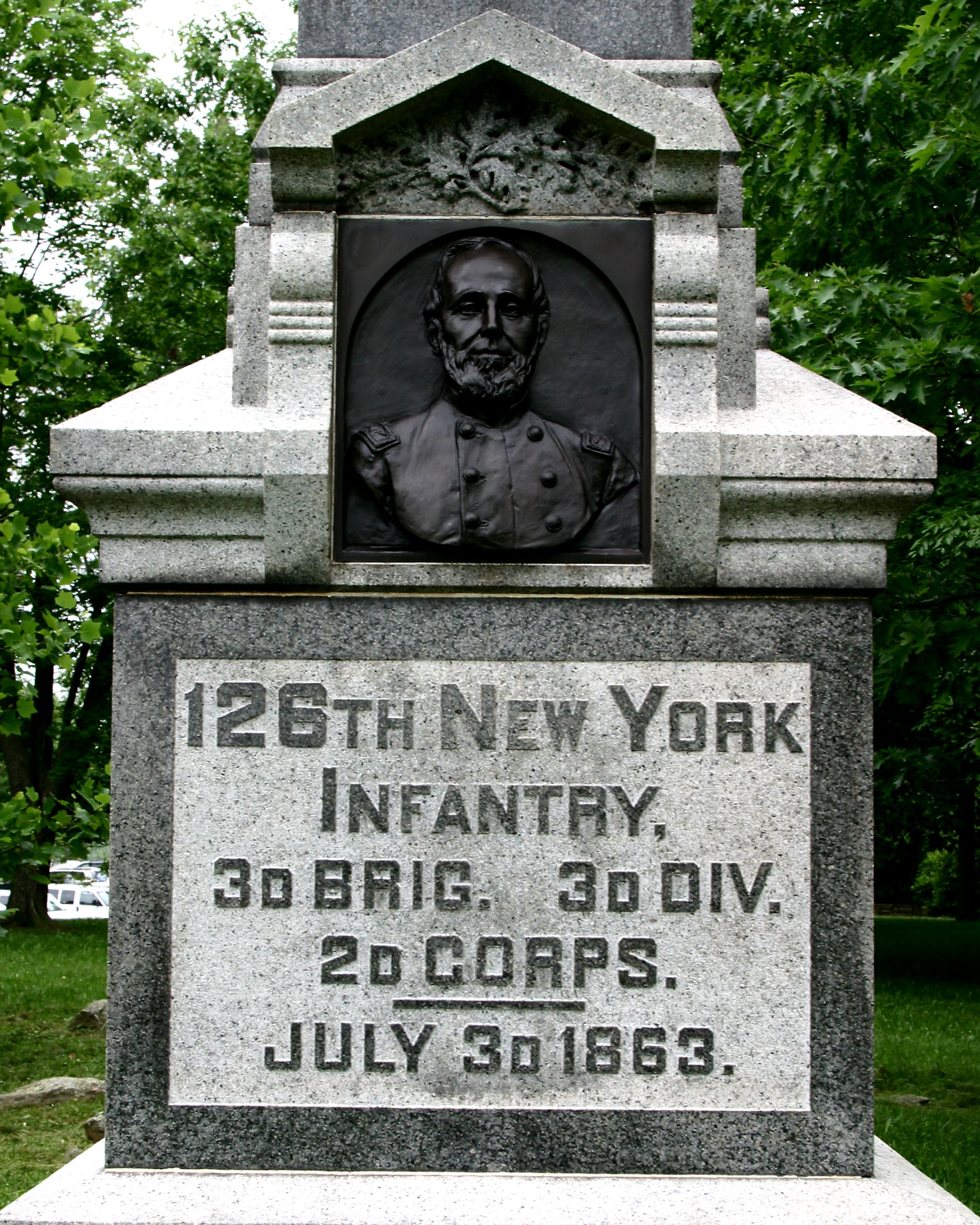 1 of 90 Monuments to New York. Indicates 126th NY Infty position Jul 3. LF&RF mkrs 66'&75,' respectively, N-S from Mn. Mn located E side Hancock Ave in Ziegler Grove. || Mn & 2 flank markers. Mn: 8'5"x7'5" base, 16'4"H. Stepped base to polished & finished stepped stone shaft, pryamidal cap w/ trefoil finial. Excised inscription, bronze bas-relief, medallion, & tablets. RF&LF markers: 1'sq x 1'10"H