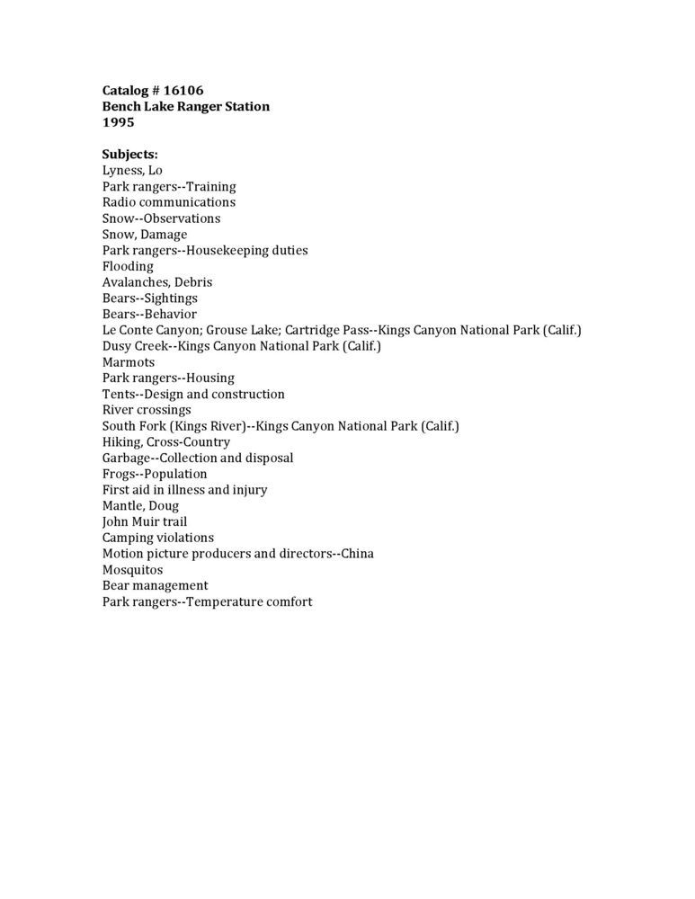 Subject Index for Ranger Log 1995, Bench Lake Ranger Station, Sequoia Kings Canyon National Parks