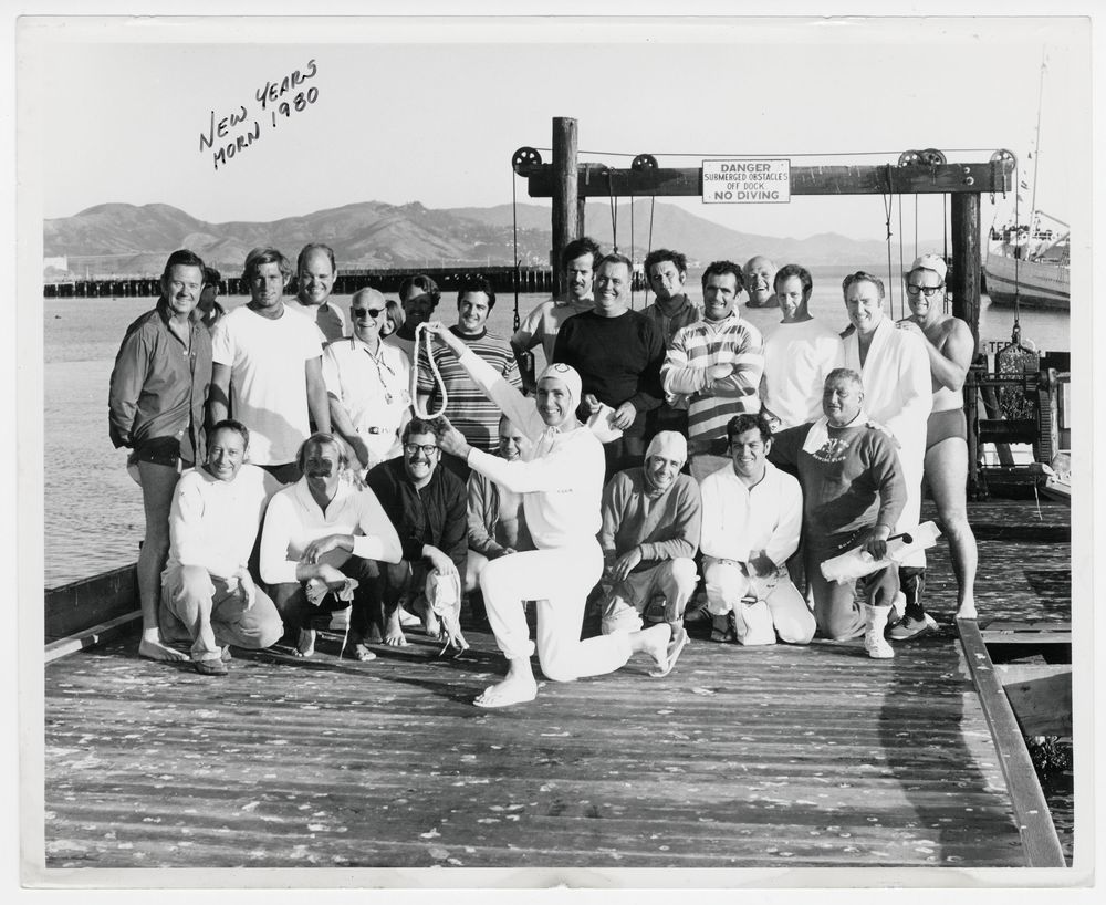 South End Rowing Club group portrait of twenty four people on the boathouse dock on New Year's morning, 1980