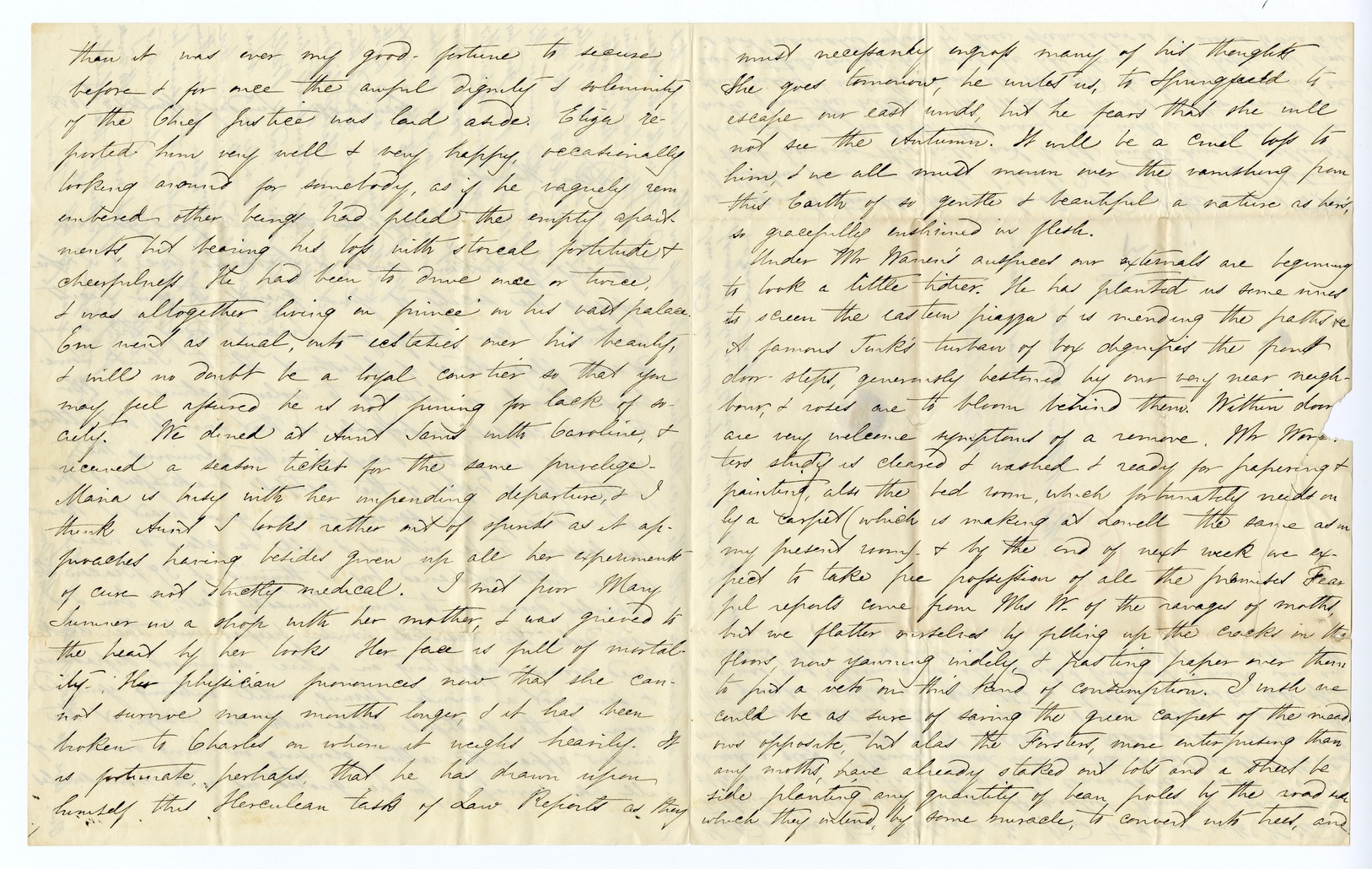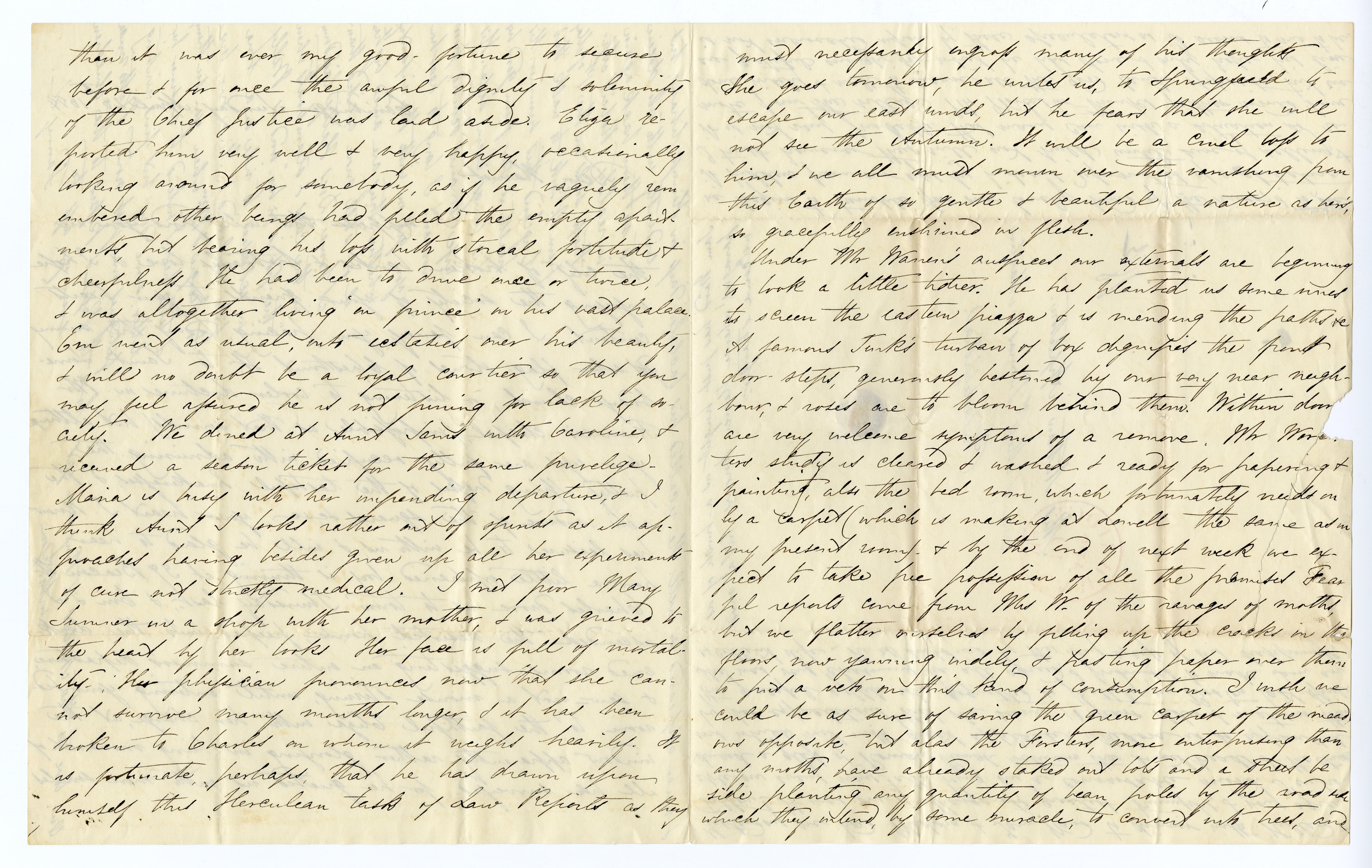 I suppose this will find you in the city of broken banks & brotherly love & I hope enjoying the society of your friends to your heart’s content. I can fancy you pacing, today the sunny yet sober flag stones of Chestnut St. to Saint Somebody’s church, or listening to cooler doctrine in Mr Furnace’s chapel, (impossible as that sounds) but although your eyes are fully occupied with admiring the pretty Spring dresses of the tasteful Quakeresses, & the rich verdure of the squares, &c, &c, your heart I know has leisure to be with us & will be glad to hear how a little orphaned boy is thriving at 39 Beacon St. Charles drove us to town Thursday last & Em & I ascended the deserted house peeped into the darkened rooms suggesting an entire summer’s departure & saw – not a mouse stirring, until entering your bedroom lo’ the faithful Eliza with her charge, at the window apparently rather glorying in being monarch of all he surveyed, for he greeted us with more smiles [p. 2] than it was ever my good-fortune to secure before & for once the awful dignity & solemnity of the Chief Justice was laid aside. Eliza reported him very well & very happy, occasionally looking around for somebody, as if he vaguely remembered other beings had filled the empty apartments, but bearing his loss with stoical fortitude & cheerfulness He had been to drive once or twice, & was altogether living ‘on prince’ in his vast palace. Em went as usual, into ecstasies over his beauty, & will no doubt be a loyal courtier so that you may feel assured he is not pining for lack of society. We dined at Aunt Sam’s with Caroline, & received a season ticket for the same privelige [sic] – Maria is busy with her impending departure, & I think Aunt S looks rather out of spirits as it approaches having besides given up all her experiments of cure not strictly medical. I met poor Mary Sumner in a shop with her mother, & was grieved to the heart by her looks Her face is full of mortality. Her physician pronounces now that she cannot survive many months longer, & it has been broken to Charles on whom it weighs heavily. It is fortunate, perhaps, that he has drawn upon himself this Herculean task of Law Reports as they [p. 3] must necessarily engross many of his thoughts She goes tomorrow, he writes us, to Springfield to escape our east winds, but he fears that she will not see the Autumn. It will be a cruel loss to him, & we all must mourn over the vanishing from this Earth of so gentle & beautiful a nature as her’s, so gracefully enshrined in flesh.