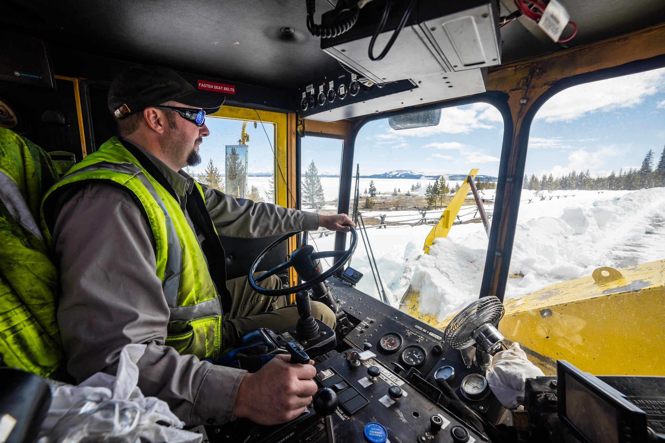 Looking inside the cab of a large rotary blower with the driver operating it.