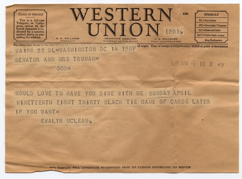 A telegram from Evalyn McLean inviting Harry and Bess Truman to dinner and cards. The telegram is from Western Union.