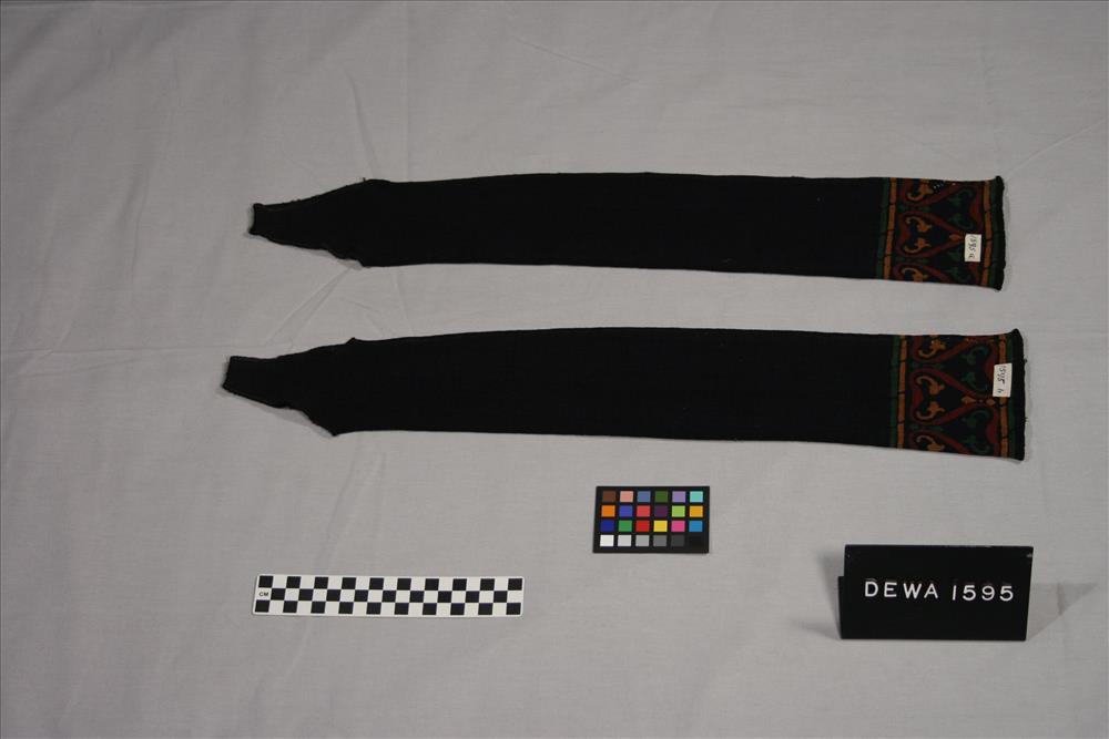 Black legging without feet, stenciled in red, green, and orange, mended