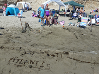 Two girls stand behind a sand sculpture that is labeled Atlantis.