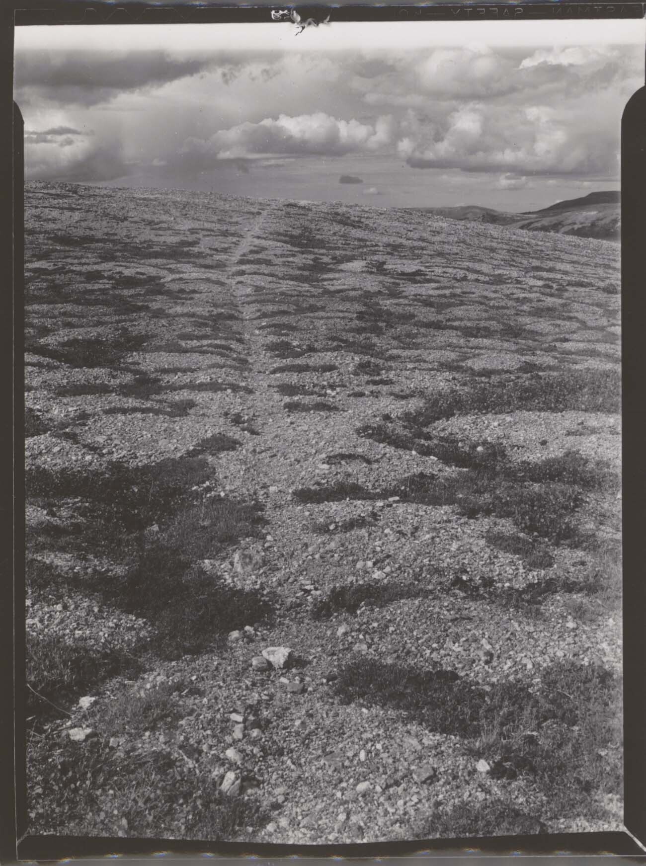 Sheep trail to lick (over skyline) in Ewe Creek. Cut 1” to 2” deep. Negative #: 10,707. Locality: Mt. McKinley National Park [Denali National Park]. Location of Negative: Wildlife Division, Director’s Office. [This information comes from the reverse of the envelope for this negative number.].