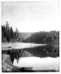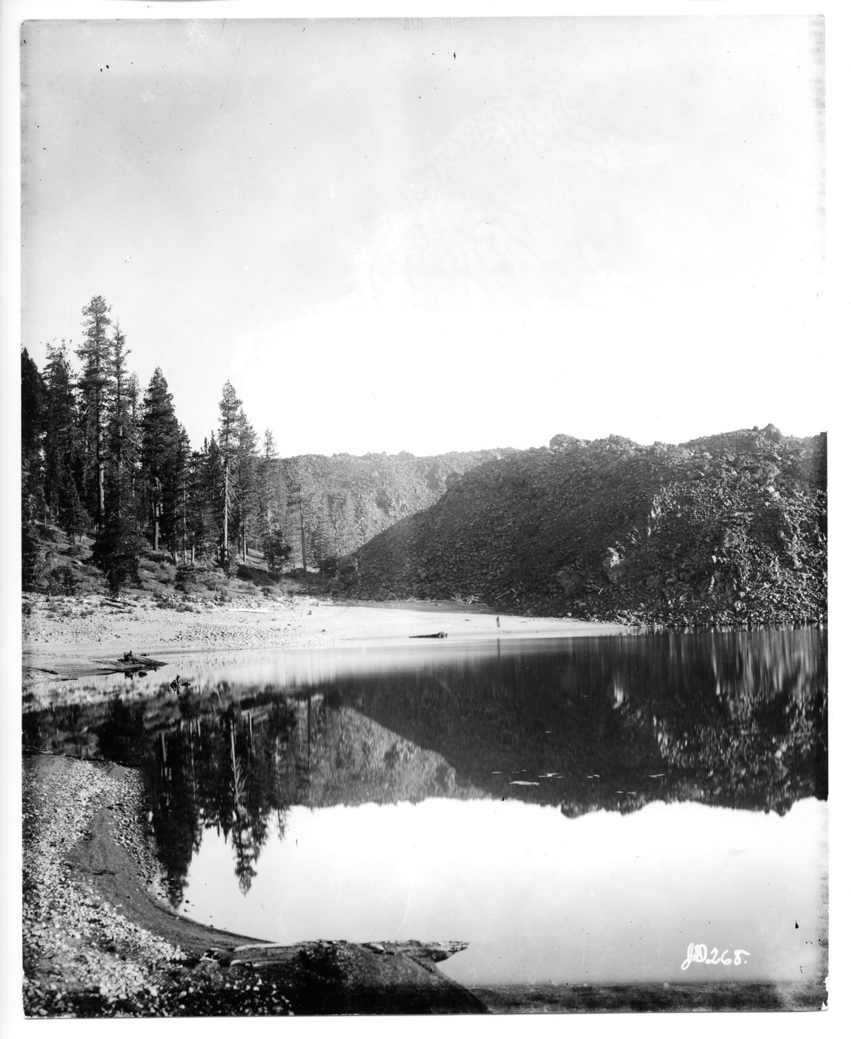 Joseph Silas Diller Historical Cinder Cone Photograph Collection:Edge of lava field at northwest corner of Snag Lake with man, dwarfed by lava flow, standing on beach