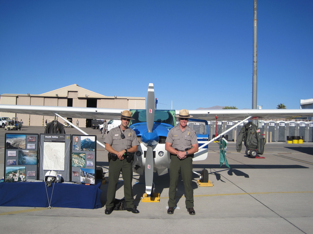 Two NPS pilots stand in front of an airplane and a Death Valley National Park exhibition table.