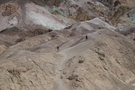 Artists Drive Artists Point hike. Fine gravely mountains with rainbow splotches. Hikers walk on top and beside them.