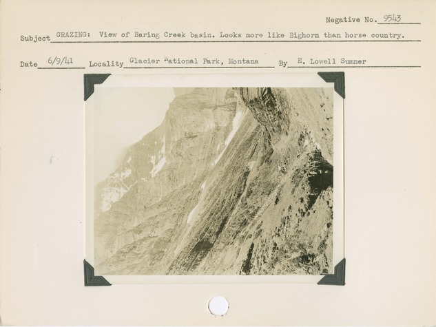 Grazing: View of Baring Creek basin. Looks more like Bighorn than horse country. Locality: Glacier National Park, Montana. Negative #: 9543