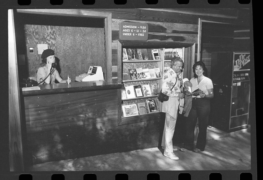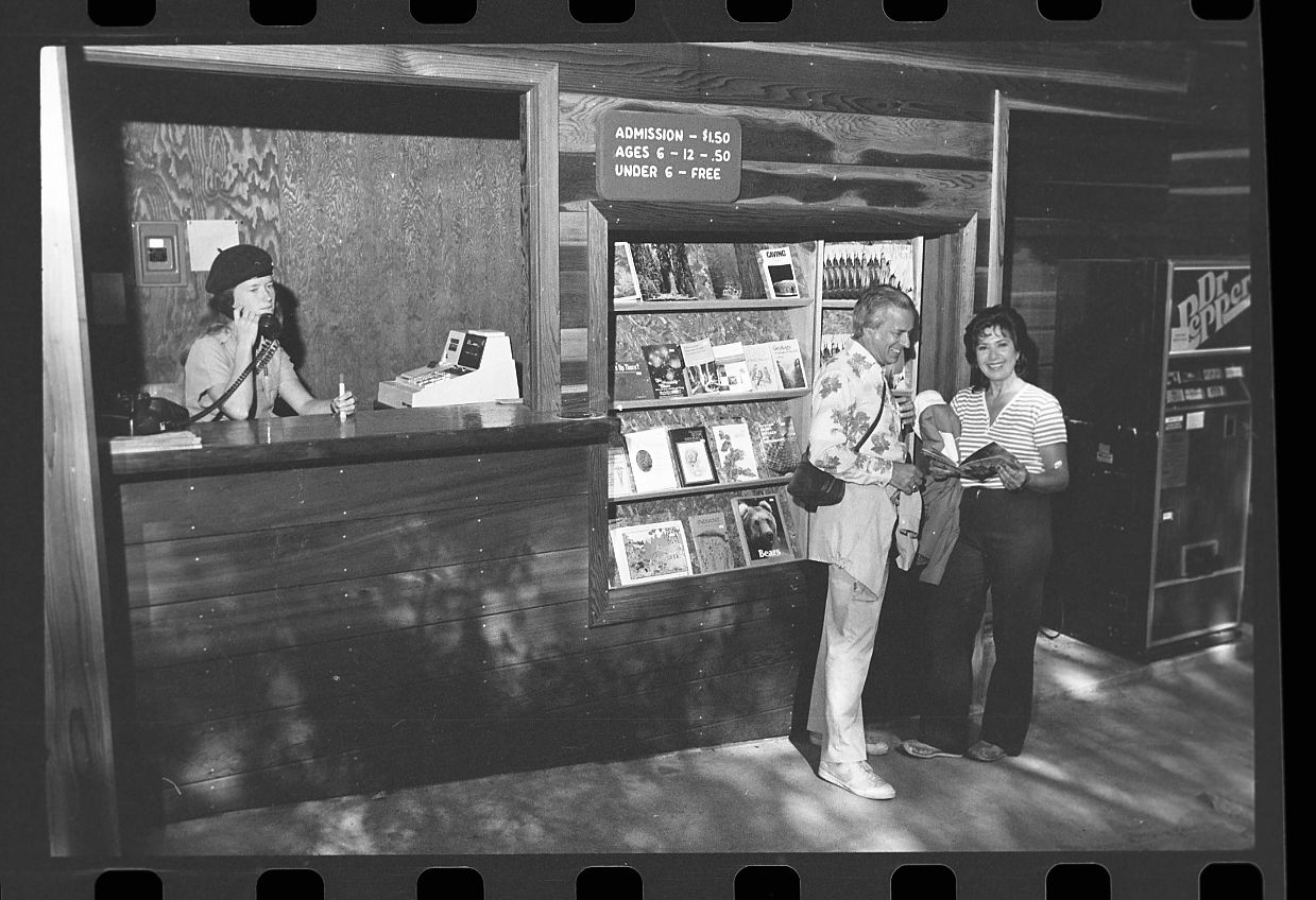 Crystal Cave, Misc. Visitor Activities. Interpretive Activities - Crystal Cave ticket booth with visitors. Peggy Moore, cashier.
