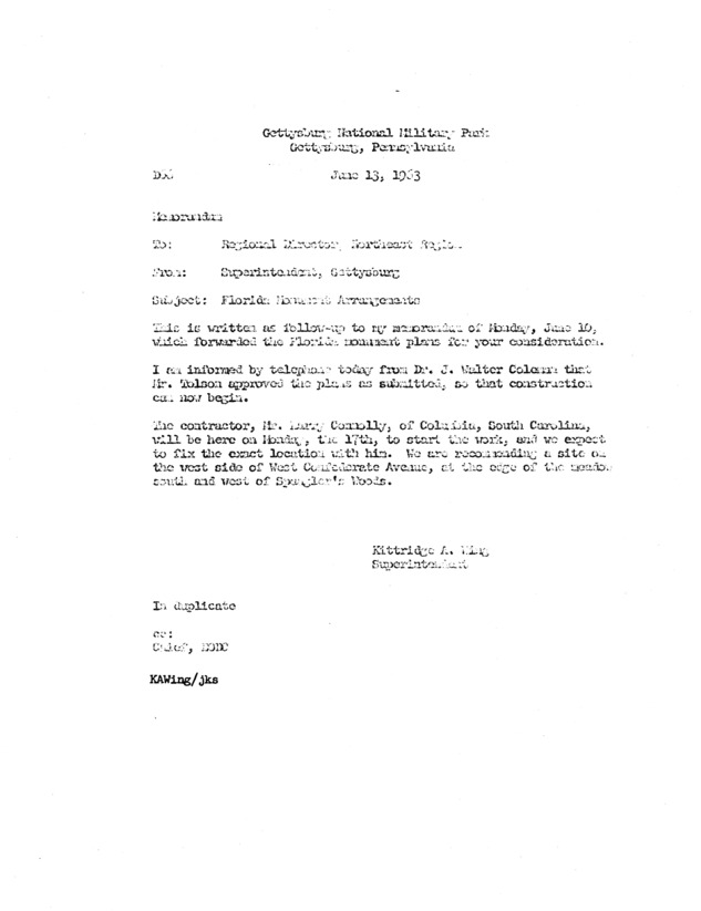 The contractor, Mr. Larry Connolly, of Columbia, South Carolina, will be here on Monday, the 17th, to start the work, and we expect to fix the exact location with him. We are recommending a site on the west side of West Confederate Avenue, at the edge of the meadow south and west of Spangler’s Woods.