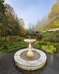 Two-tired white fountain in a landscaped garden wet on a wet and foggy morning