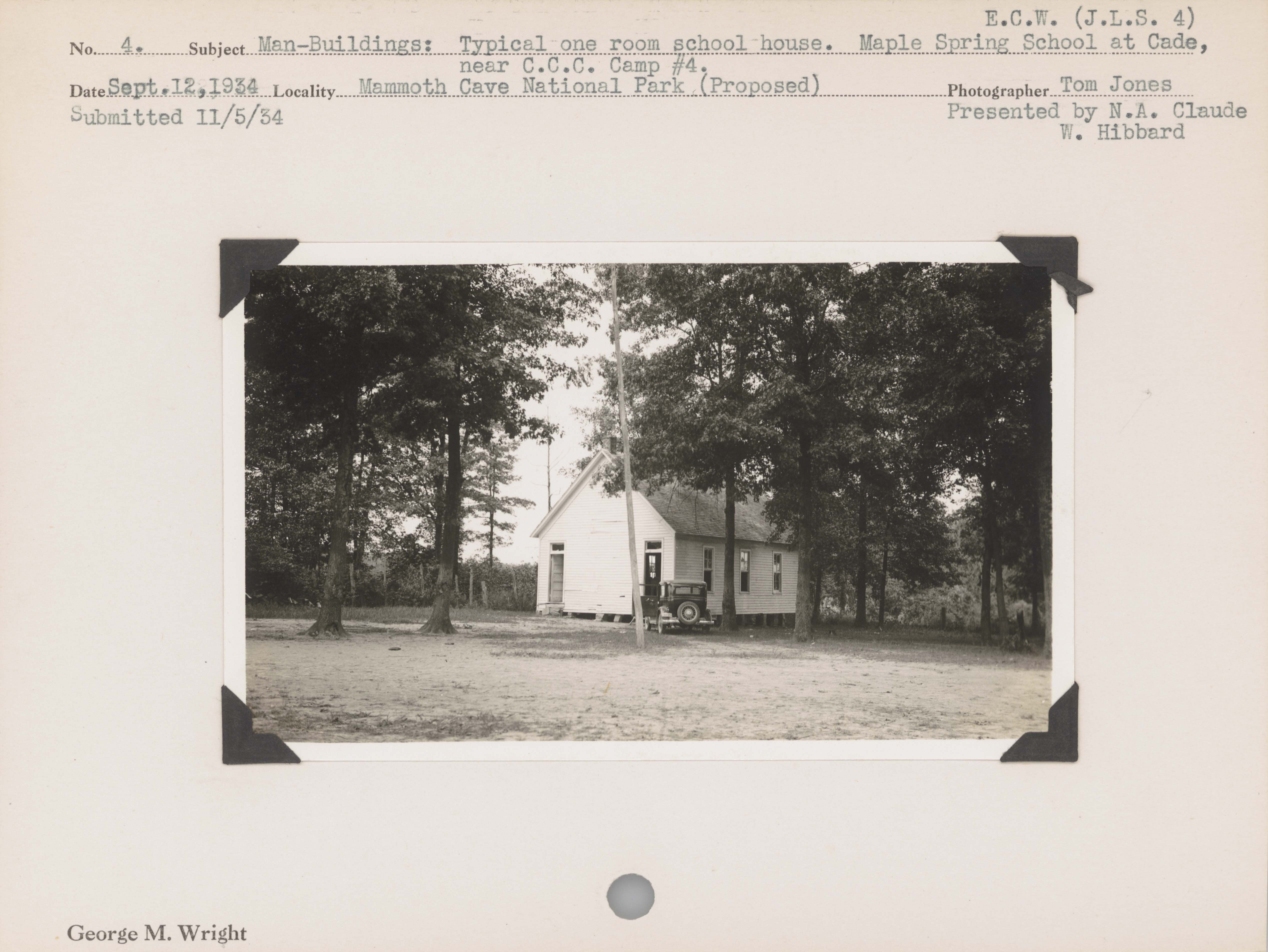 Man--Buildings--Typical one room school house. Maple Spring School at Cade, near CCC [Civilian Conservation Corps] Camp. Locality: Mammoth Cave National Park (Proposed). Negative #: ecw-jls4. [Emergency Conservation Work]. Presented by N.A. Claude W. Hibbard. Submitted 11/5/1934