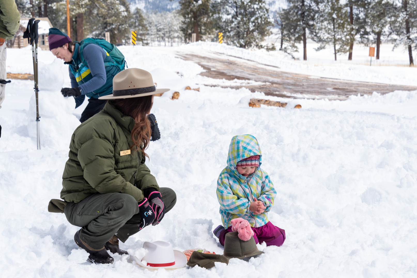 A park ranger kneels in the snow next to a child while she builds a snowball.