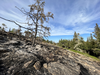 A burnt jack pine stands in the black of the Mount Franklin Fire burn area.