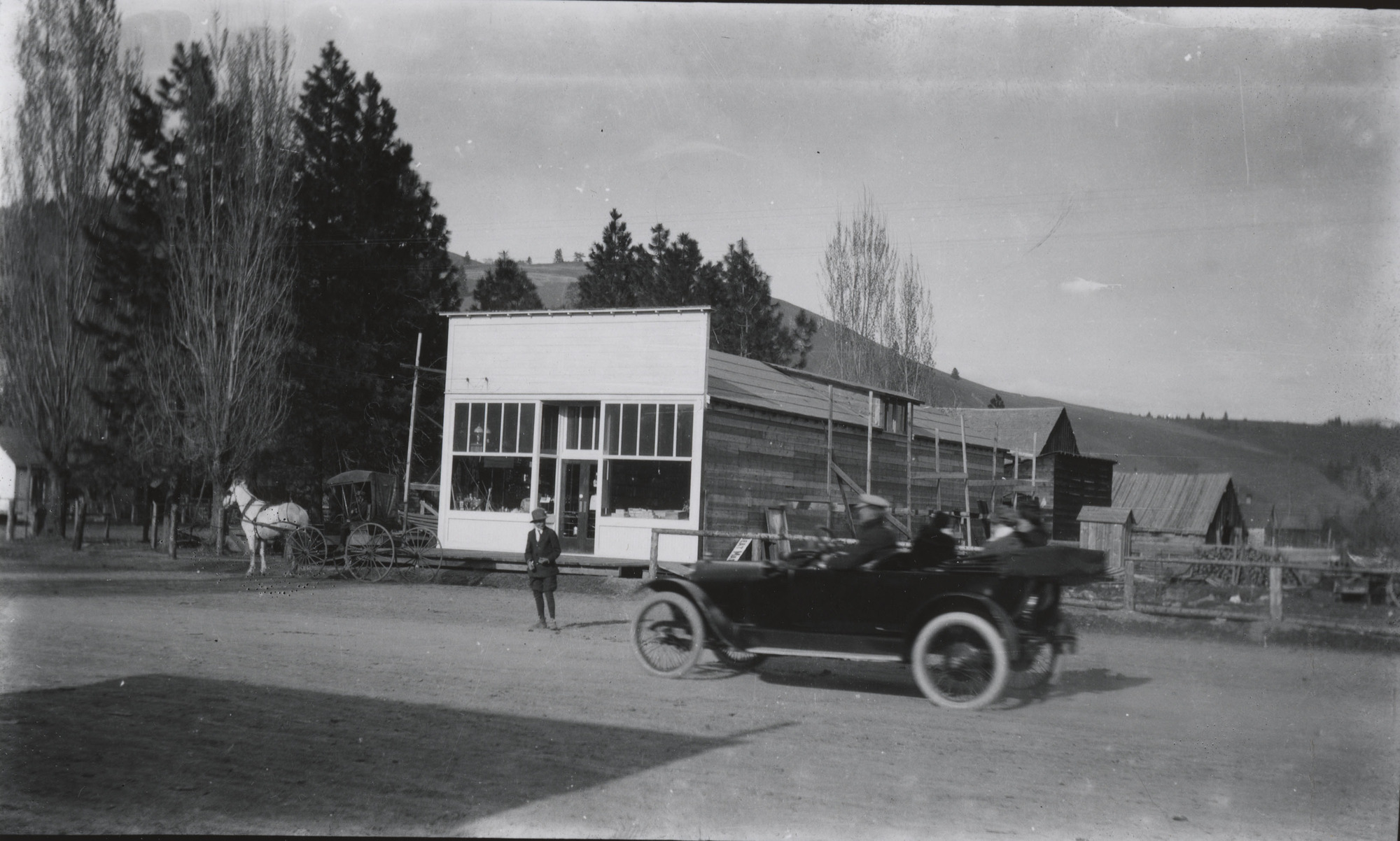 Black and white photograph of a 1920s style car passing in front of a storefront