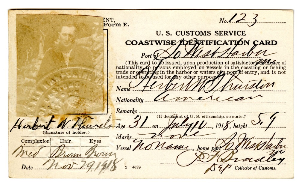 Herbert W. Thurston 1918 Coastwise Identification Card