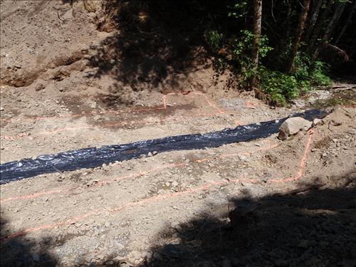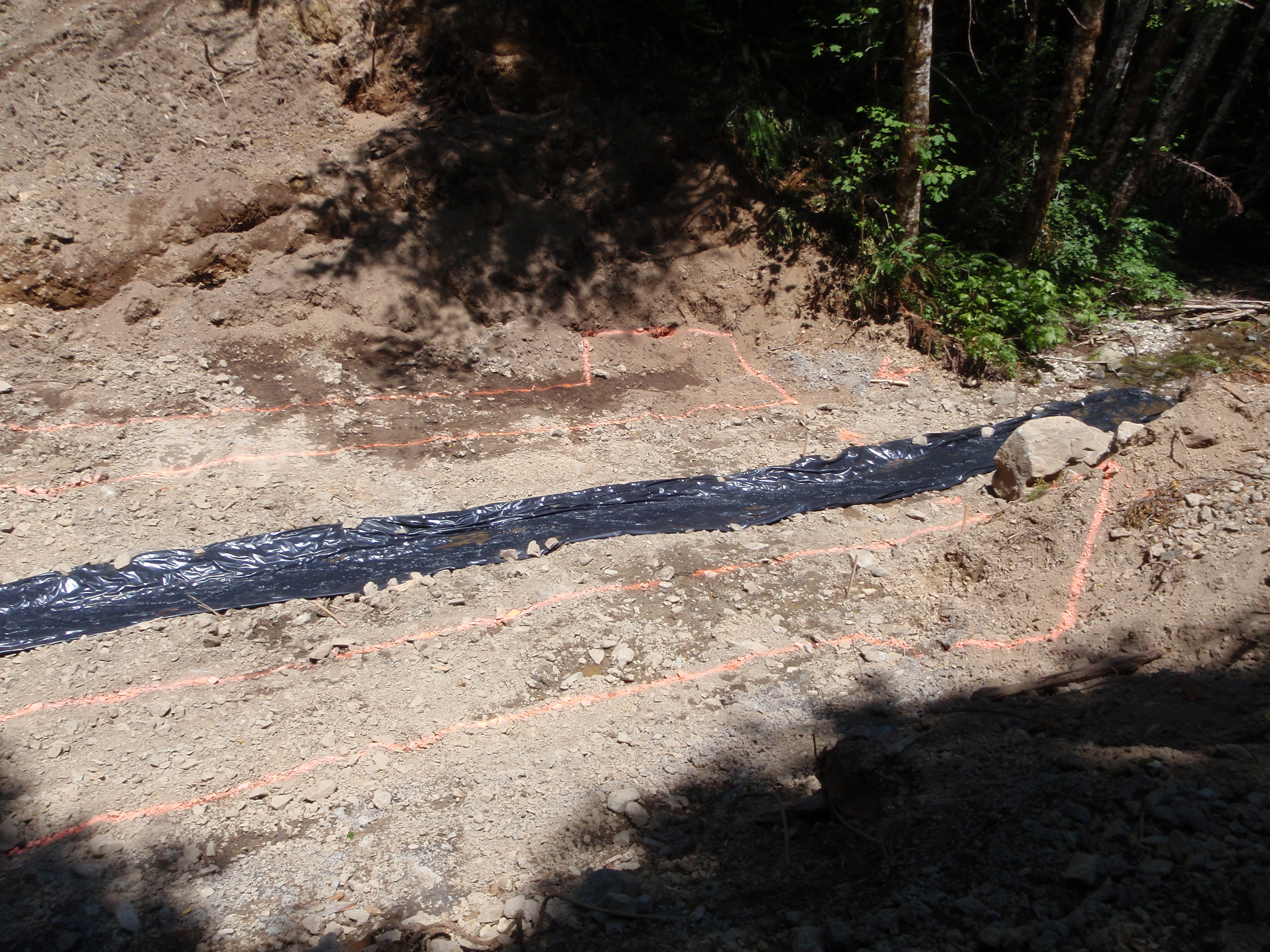 View from right bank (as defined by looking downstream). The footprint of the pipe arch footing is marked with color paint. Stream flow has been routed onto black plastic sheeting down center of excavation.