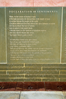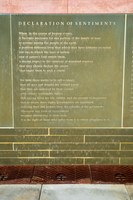A greenish stone wall engraved with the first two stanzas of the Declaration of Sentiments, with water running over it.