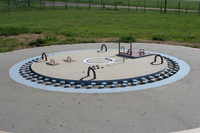 In a field of grass, a large concrete circular pad with a yellow stripe around the outside and a blue circle in the middle. Large red metal bars come out of the ground inside it like giant handlebars.
